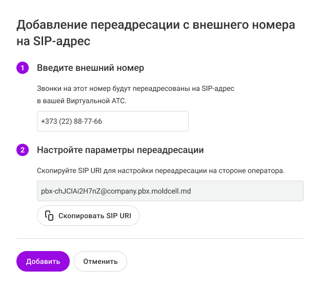 2. Введите номер телефона и скопируйте полученный SIP URI.