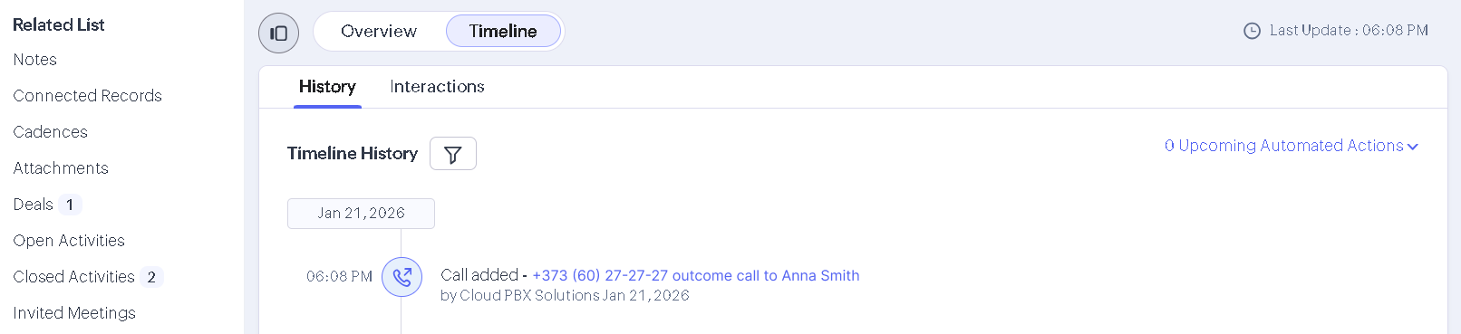 Исходя из задач вашего бизнеса, вы можете сами настроить события, которые будут происходить в Zoho CRM автоматически при каждом типе звонка (входящий или исходящий, успешный или неуспешный, с известного или незнакомого номера). В Zoho CRM могут создаваться: