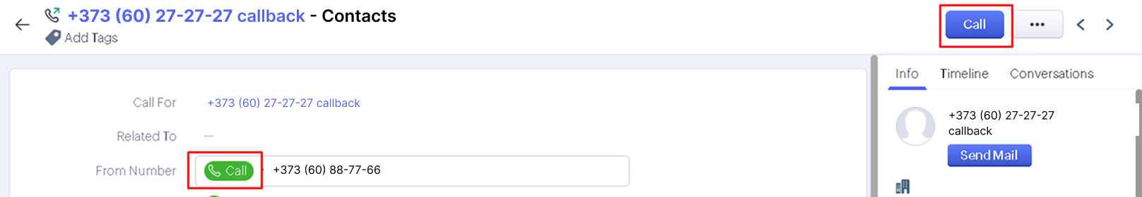 • Из карточки звонка или контакта: нажмите на кнопку Call в правом верхнем углу или на зеленую кнопку у номера клиента.