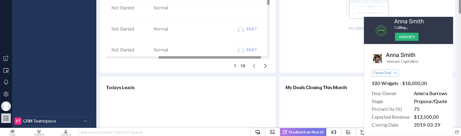 Виджет появляется с первым гудком прямо в интерфейсе Zoho CRM. Еще до того, как менеджер нажмет кнопку «Ответить», он уже будет знать: