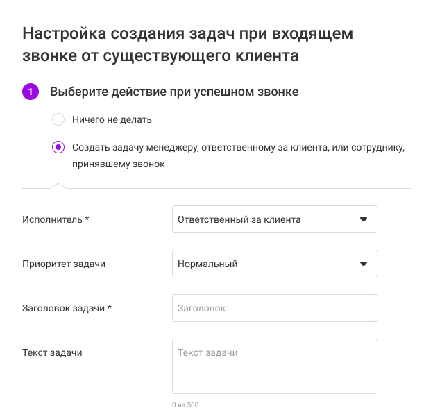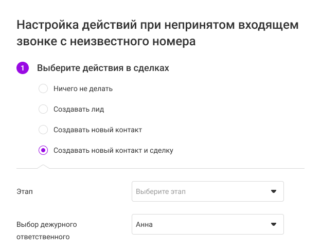 Например, если звонок поступил от существующего клиента, то ответственным за сделку и задачу может быть назначен сотрудник, принявший звонок, либо ответственный за контакт.