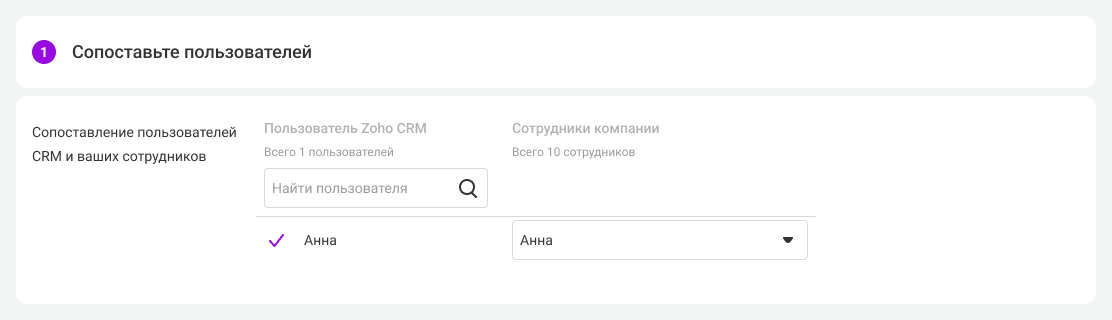 3. Сопоставьте всех пользователей АТС с пользователями Zoho, чтобы системы могли правильно отражать связанные с ними события. В Zoho CRM будут заноситься звонки только сопоставленных пользователей. При добавлении новых сотрудников в будущем тоже необходимо будет их сопоставить.