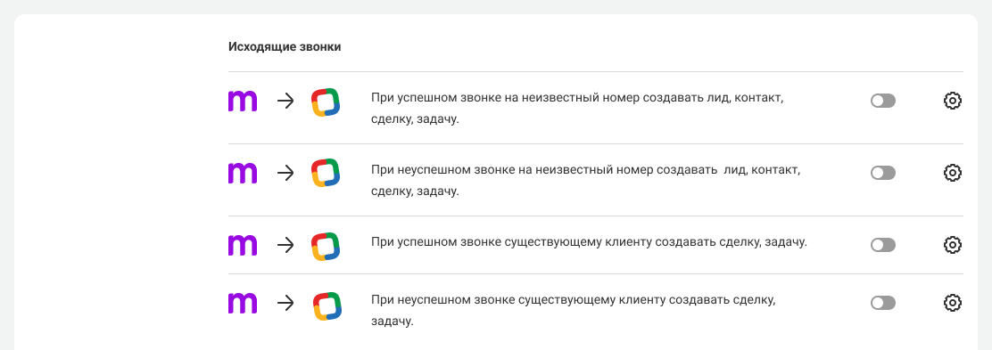 Вы можете настроить сценарии интеграции отдельно для входящих звонков.